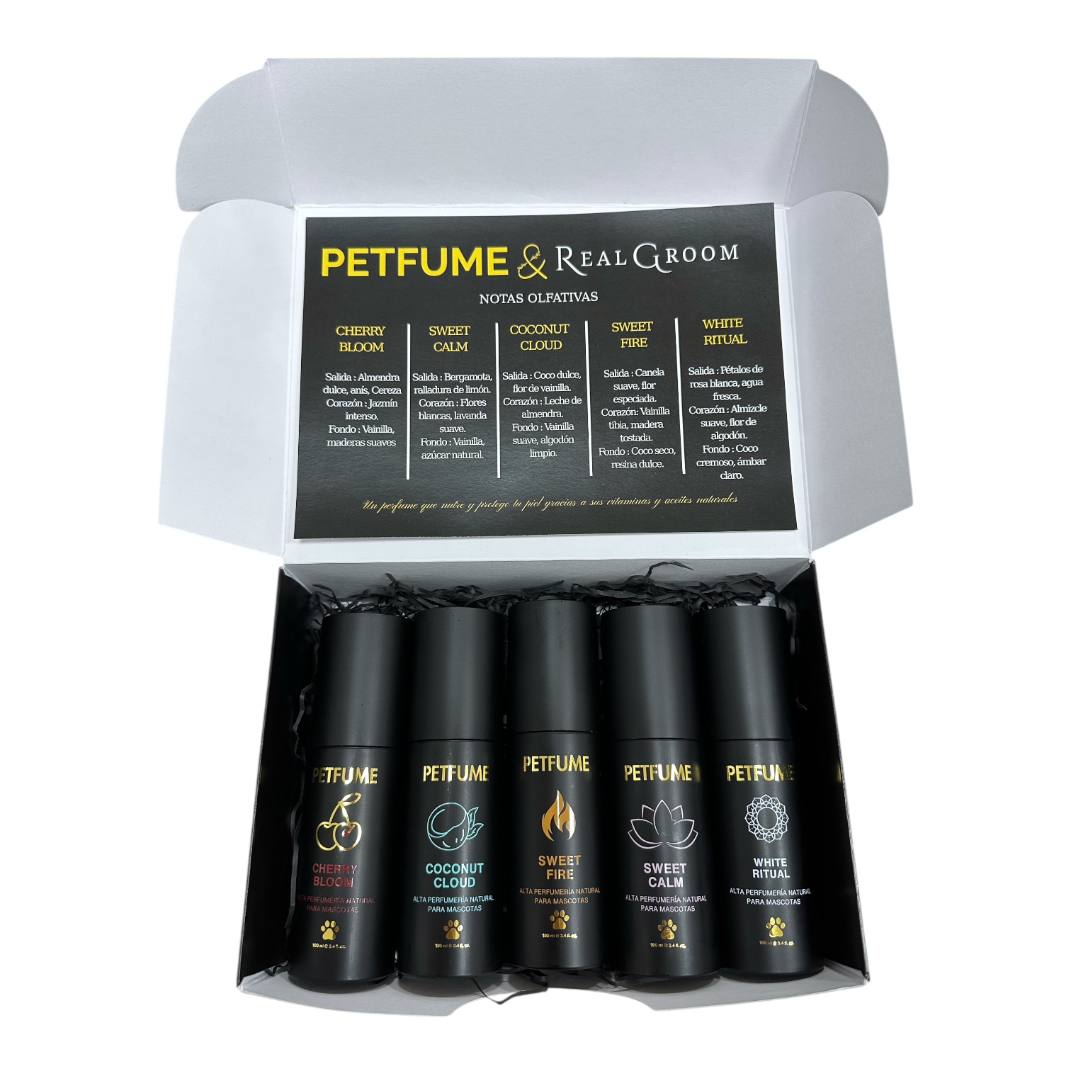 El Pack Especial PETFUME by The Real Groom es una edición exclusiva diseñada para que profesionales y clientes puedan experimentar la colección completa de perfumería de alta gama para mascotas en un solo estuche.