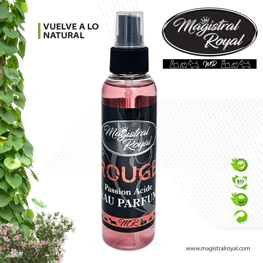 El perfume para perros Rouge de Magistral Royal está enriquecida con el aroma de las praderas y flores silvestres.